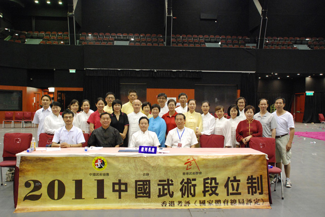 國家體育總局與2011年8月15至17日在香港首次施行新的中國武術段位制考評。我會有15名會員分別申報了3至5段,并于17日在香港九龍國際展貿中心參加考評。下圖一是考評結束后考段會員和總會工作人員與考評裁判合照;圖二是總會主席彭華軍代表總會向考評主裁判、國家級教練、中國武術九段陳順安老師贈送紀念品。